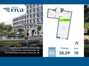 Продается 1-комн. квартира-студия с отделкой в ЖК "Аквилон RIVA" на 10 этаже. Общая площадь: 28.29 кв.м., площадь гостиной 20.44 кв.м., из которых 5 кв.м. выделено под кухонную зону. Все окна выходят на одну сторону. В квартире один совмещенный санузел. Высота потолков 2.73 м.