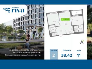 Продается двухкомнатная квартира от застройщика с отделкой в ЖК "Аквилон RIVA" на 11 этаже. Общая площадь: 58.42 кв.м., площадь просторной кухни-столовой: 18.82 кв.м. Высота потолков 2.73 м.