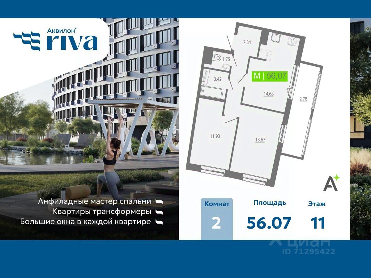 Продается 2-комн. квартира с отделкой в ЖК "Аквилон RIVA" на 11 этаже. Общая площадь: 56.07 кв.м., площадь просторной кухни-столовой: 14.68 кв.м. Высота потолков 2.73 м.
