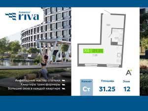 Просторная 1-комн. квартира-студия с отделкой в ЖК "Аквилон RIVA" на 12 этаже. Общая площадь: 31.25 кв.м., площадь гостиной 17.89 кв.м., из которых 5 кв.м. выделено под кухонную зону. Все окна выходят на одну сторону. В квартире один совмещенный санузел. Высота потолков 2.73 м.