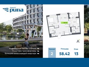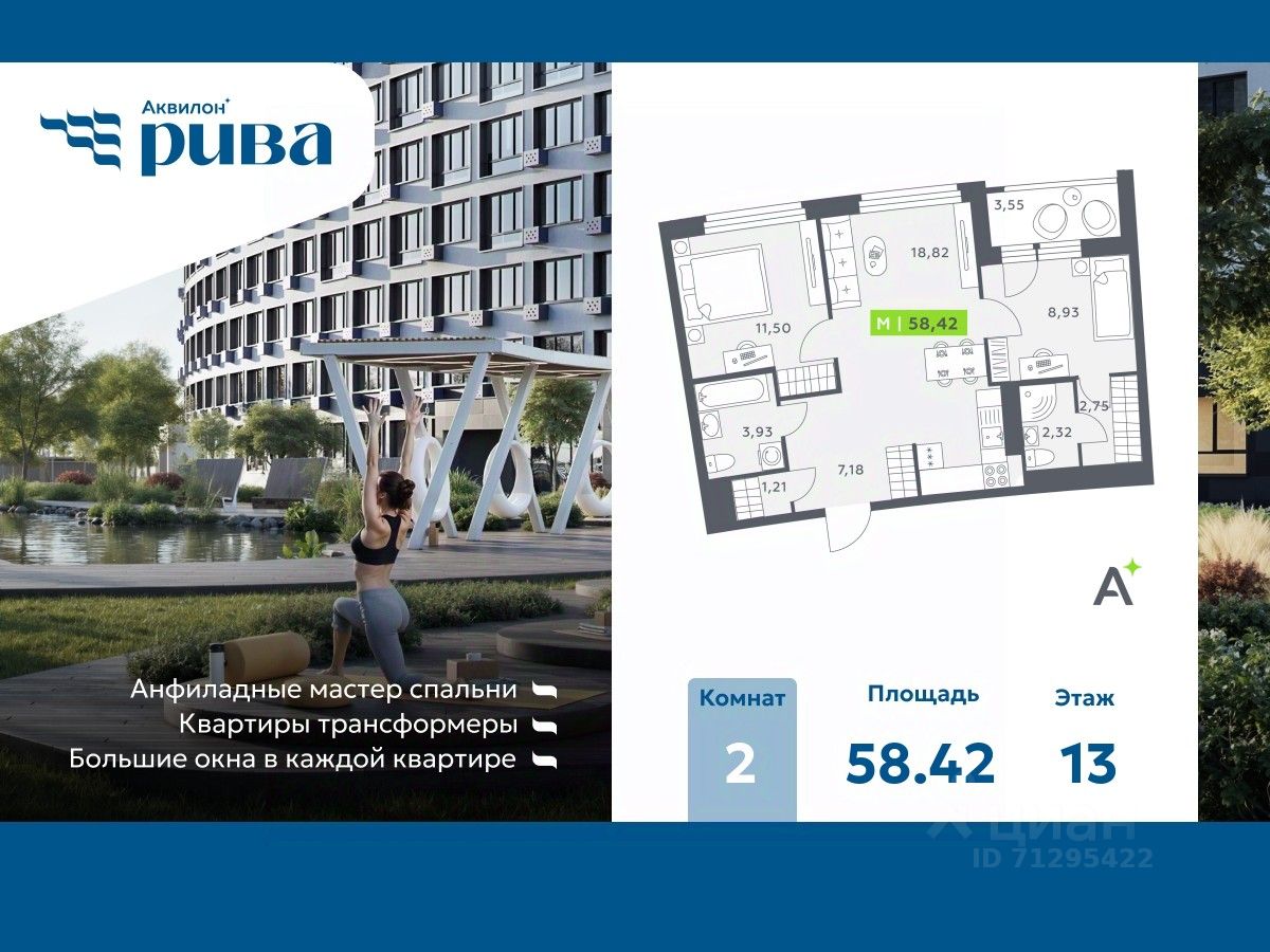 2-комн. квартира от застройщика с предчистовой отделкой в ЖК "Аквилон Рива" на 13 этаже. Общая площадь: 58.42 кв.м., площадь просторной кухни-столовой: 18.82 кв.м. Высота потолков 2.73 м.
