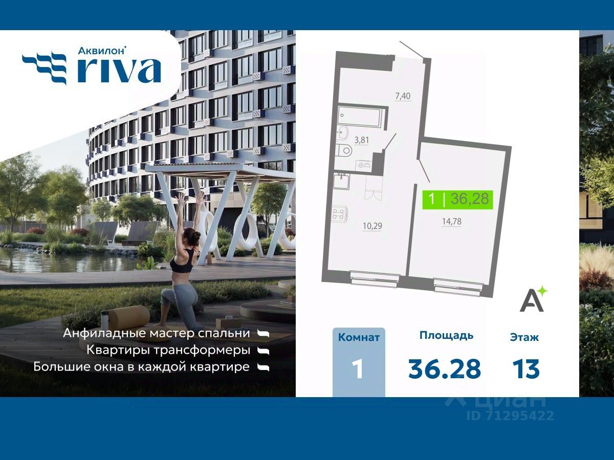 1-комн. квартира с отделкой в ЖК "Аквилон RIVA" на 13 этаже. Общая площадь: 36.28 кв.м., площадь просторной кухни-столовой: 10.29 кв.м. Высота потолков 2.73 м.
