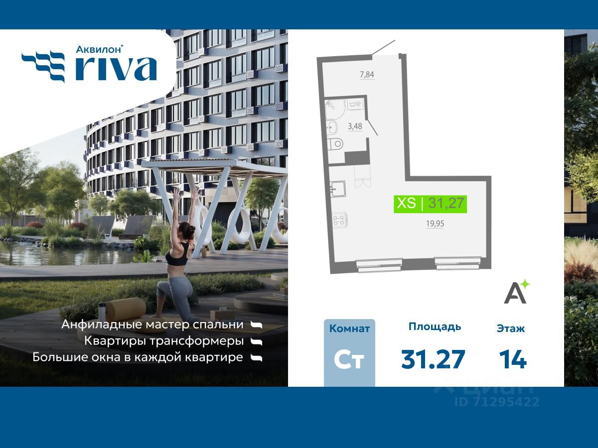 Продается 1-комн. квартира-студия с отделкой в ЖК "Аквилон RIVA" на 14 этаже. Общая площадь: 31.27 кв.м., площадь гостиной 19.95 кв.м., из которых 5 кв.м. выделено под кухонную зону. Все окна выходят на одну сторону. В квартире один совмещенный санузел. Высота потолков 2.73 м.