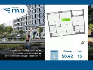 2-комн. квартира с отделкой в ЖК "Аквилон RIVA" на 15 этаже. Общая площадь: 58.42 кв.м., площадь просторной кухни-столовой: 18.82 кв.м. Высота потолков 2.73 м.
