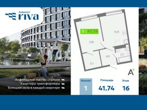 Однокомнатная квартира от застройщика с отделкой в ЖК "Аквилон RIVA" на 16 этаже. Общая площадь: 41.74 кв.м., площадь просторной кухни-столовой: 14.36 кв.м. Высота потолков 2.73 м.