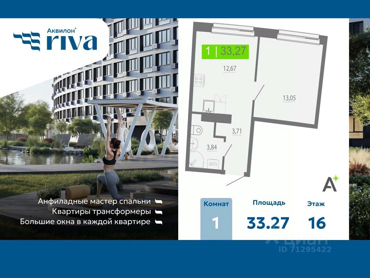 Продается 1-комн. квартира с отделкой в ЖК "Аквилон RIVA" на 16 этаже. Общая площадь: 33.27 кв.м., площадь просторной кухни-столовой: 12.67 кв.м. Высота потолков 2.73 м.