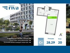 Однокомнатная квартира-студия от застройщика с отделкой в ЖК "Аквилон RIVA" на 20 этаже. Общая площадь: 28.29 кв.м., площадь гостиной 20.44 кв.м., из которых 5 кв.м. выделено под кухонную зону. Все окна выходят на одну сторону. В квартире один совмещенный санузел. Высота потолков 2.73 м.