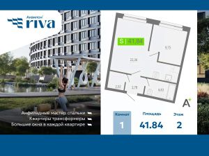 Однокомнатная квартира от застройщика с отделкой в ЖК "Аквилон RIVA" на 2 этаже. Общая площадь: 41.84 кв.м., площадь просторной кухни-столовой: 22.36 кв.м. Высота потолков 2.73 м.