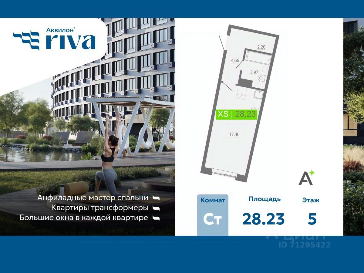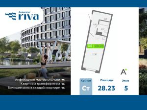 Однокомнатная квартира-студия от застройщика с отделкой в ЖК "Аквилон RIVA" на 5 этаже. Общая площадь: 28.23 кв.м., площадь гостиной 17.4 кв.м., из которых 5 кв.м. выделено под кухонную зону. Все окна выходят на одну сторону. В квартире один совмещенный санузел. Высота потолков 2.73 м.