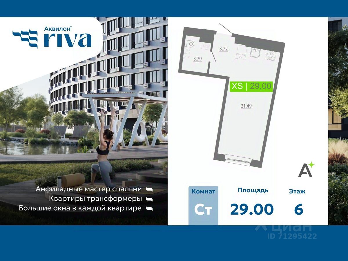 Просторная однокомнатная квартира-студия с отделкой в ЖК "Аквилон RIVA" на 6 этаже. Общая площадь: 29 кв.м., площадь гостиной 21.49 кв.м., из которых 5 кв.м. выделено под кухонную зону. Все окна выходят на одну сторону. В квартире один совмещенный санузел. Высота потолков 2.73 м.