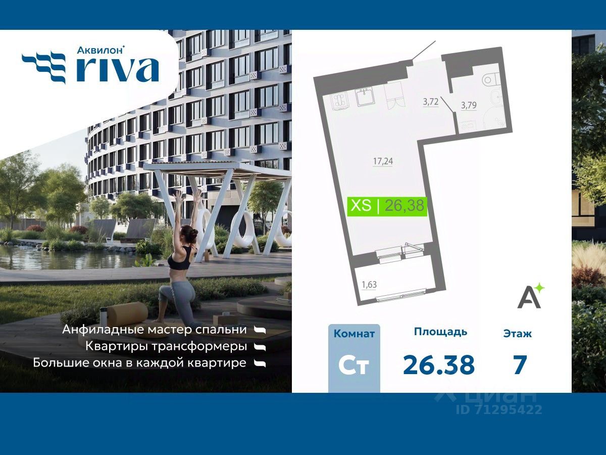 Продается 1-комн. квартира-студия от застройщика с отделкой в ЖК "Аквилон RIVA" на 7 этаже. Общая площадь: 26.38 кв.м., площадь гостиной 17.24 кв.м., из которых 5 кв.м. выделено под кухонную зону. Все окна выходят на одну сторону. В квартире один балкон, один совмещенный санузел. Высота потолков 2.73 м.