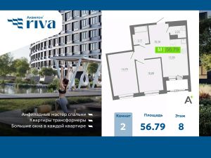 Продается 2-комн. квартира от застройщика с отделкой в ЖК "Аквилон RIVA" на 8 этаже. Общая площадь: 56.79 кв.м., площадь просторной кухни-столовой: 13.38 кв.м. Высота потолков 2.73 м.