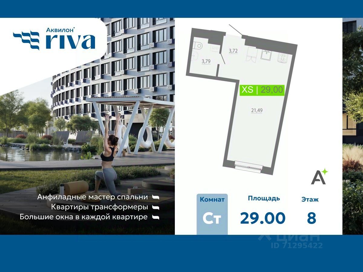 Продается 1-комн. квартира-студия с отделкой в ЖК "Аквилон RIVA" на 8 этаже. Общая площадь: 29 кв.м., площадь гостиной 21.49 кв.м., из которых 5 кв.м. выделено под кухонную зону. Все окна выходят на одну сторону. В квартире один совмещенный санузел. Высота потолков 2.73 м.