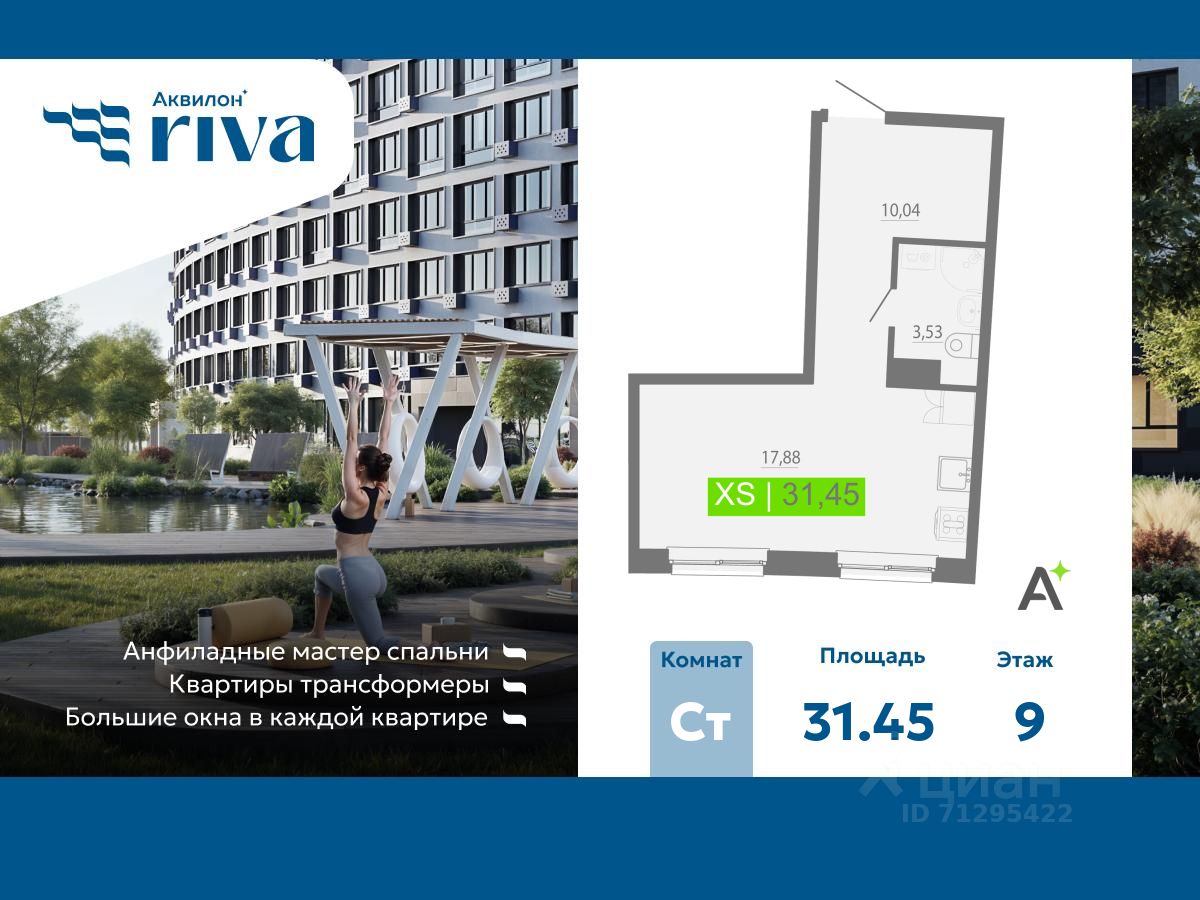 1-комн. квартира-студия с отделкой в ЖК "Аквилон RIVA" на 9 этаже. Общая площадь: 31.45 кв.м., площадь гостиной 19.94 кв.м., из которых 5 кв.м. выделено под кухонную зону. Все окна выходят на одну сторону. В квартире один совмещенный санузел. Высота потолков 2.73 м.