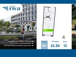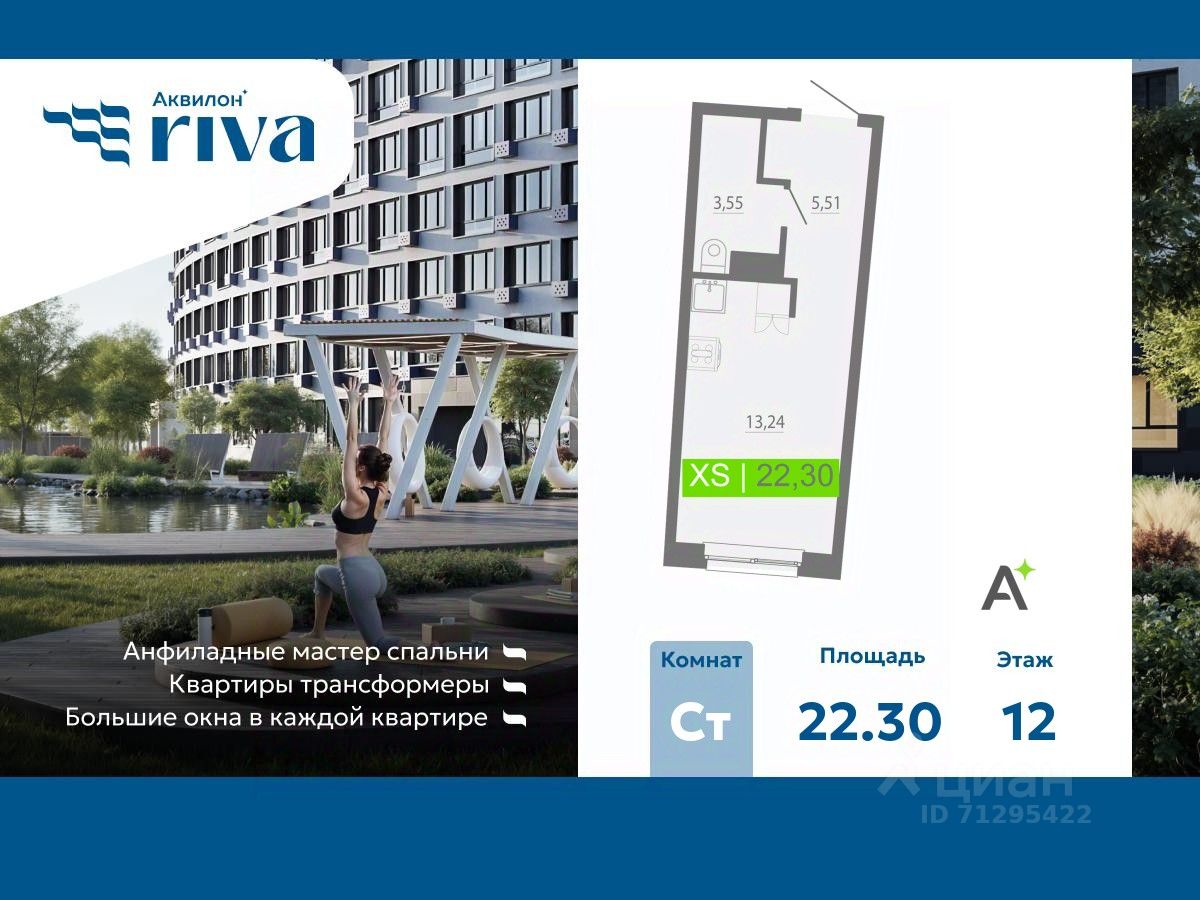 Продается 1-комн. квартира-студия от застройщика с отделкой в ЖК "Аквилон RIVA" на 12 этаже. Общая площадь: 22.3 кв.м., площадь гостиной 13.24 кв.м., из которых 5 кв.м. выделено под кухонную зону. Все окна выходят на одну сторону. В квартире один совмещенный санузел. Высота потолков 2.73 м.