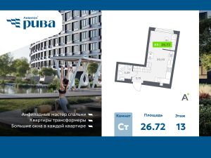 1-комн. квартира-студия с предчистовой отделкой в ЖК "Аквилон Рива" на 13 этаже. Общая площадь: 26.72 кв.м., площадь гостиной 20.2 кв.м., из которых 5 кв.м. выделено под кухонную зону. Все окна выходят на одну сторону. В квартире один совмещенный санузел. Высота потолков 2.73 м.