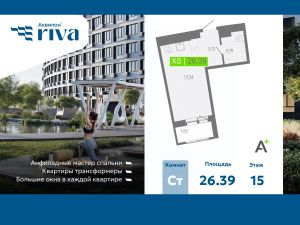 Просторная 1-комн. квартира-студия с отделкой в ЖК "Аквилон RIVA" на 15 этаже. Общая площадь: 26.39 кв.м., площадь гостиной 17.24 кв.м., из которых 5 кв.м. выделено под кухонную зону. Все окна выходят на одну сторону. В квартире один балкон, один совмещенный санузел. Высота потолков 2.73 м.