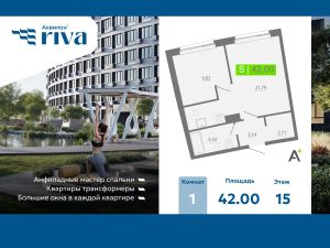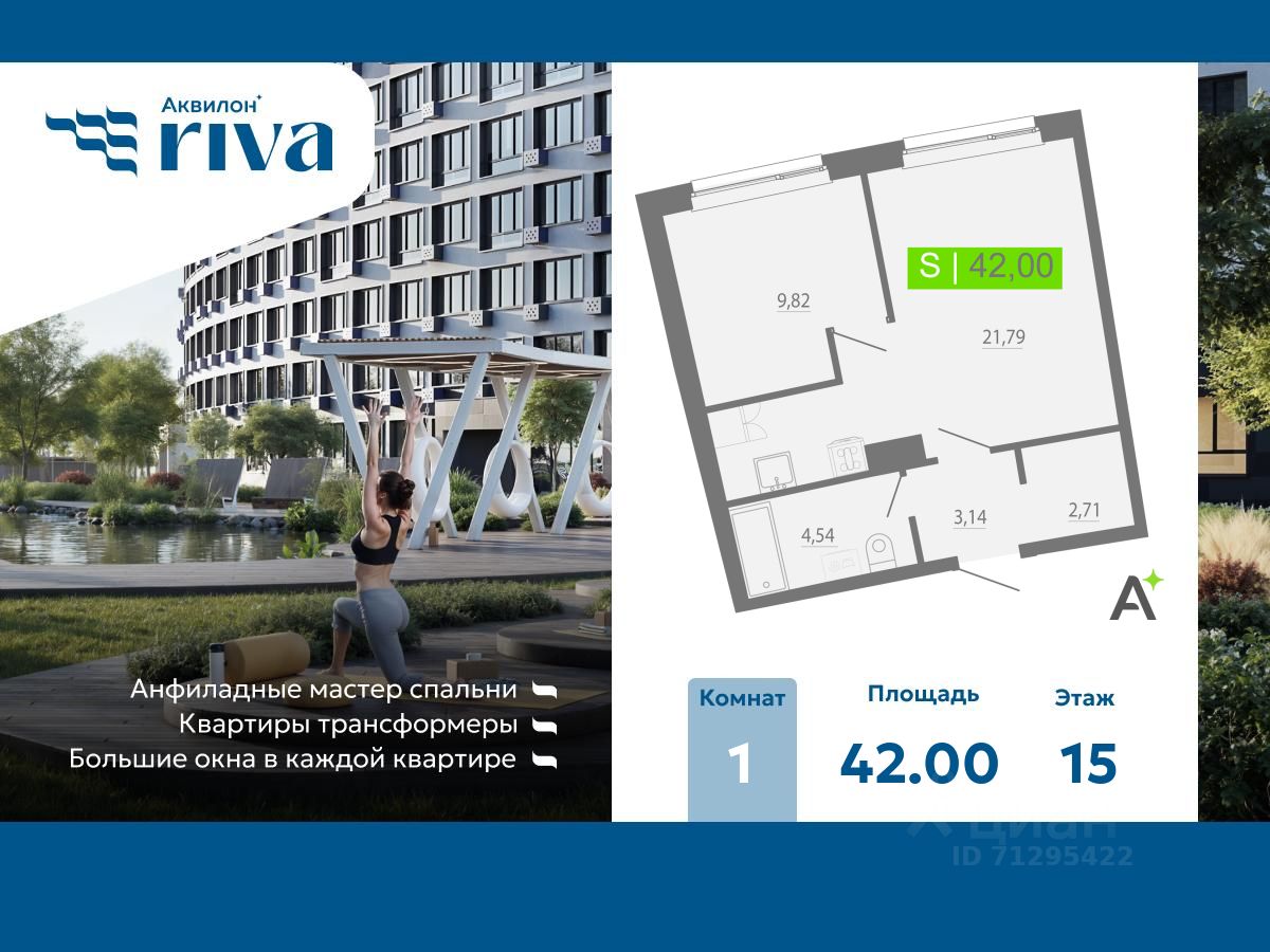 Однокомнатная квартира с отделкой в ЖК "Аквилон RIVA" на 15 этаже. Общая площадь: 42 кв.м., площадь просторной кухни-столовой: 21.79 кв.м. Высота потолков 2.73 м. Дом монолитный, трехподъездный, переменной этажности, от 16 до 20 этажей. Квартира находится в 1-й секции высотой 20 этажей в корпусе 1. На этаже 15 квартир. В подъезде 2 пассажирских и 1 грузовой лифт. Окончание строительства - 4 квартал 2027 года. Оформление сделки по договору долевого участия. В шаговой доступности от дома имеется станция метро (расстояние по прямой) "Девяткино" (1.9 км). ЖК "Аквилон RIVA" - жилой комплекс комфорт класса у метро Девяткино от Группы Аквилон В самом сердце двора раскинулся собственный водоём — не просто украшение, а часть вашей повседневной жизни. Летом — это благоустроенная набережная для прогулок, отдыха в тени деревьев и тихих вечеров у воды. А зимой водоём превращается в залитый каток — место, где звучит смех, скользят коньки и рождаются семейные традиции. Здесь каждое время года раскрывает свой характер. Зона уединения: Места для занятия йогой и медитаций Мульти скворечники Качели с подсветкой для уютных бесед Высокие скамейки на набережной для отдыха и чтения на свежем воздухе Активная зона: Развивающие детские площадки для разных возрастов Спортивные площадки с зоной Ворк-аут, Столы для настольного тенниса Площадка для пляжного волейбола Преимущества Увеличенные окна с заполнением аргоном Корзины под кондиционеры Сити-боксы вместо балконов Безбарьерная среда Бесшумные скоростные лифты Контроль доступа на территорию и видеонаблюдение Отделка квартир Чистовая отделка в трех цветовых решениях: Sand, Terra и Graphite Дозаказ для любой квартиры Стандарты Группы Аквилон для вашей комфортной жизни Thermo-S экономия на коммунальных платежах за счет дополнительно утепленных стен, кровли и цоколя. Энергоэффективные окна с селективным покрытием и аргоновым заполнением Soundstop - дополнительная шумоизоляция внутренних перегородок и межэтажных перекрытий, шумозащитные окна, малошумные лифты Light-in - в квартирах устанавливаются широкоформатные окна, увеличены на 30%. Высота подоконников на уровне 60 см от пола. Vent-in - в каждой комнате есть клапаны индивидуальной вентиляции, которые обеспечивают приток свежего воздуха с улицы. inHOME умный дом в каждой квартире Интеллектуальная цифровая система, которая позволит дистанционно решать бытовые вопросы, управлять квартирой и экономить на оплате коммунальных услуг. В состав inHOME входят: IP-домофон, Face key, "умные" счетчики, датчики протечки, дистанционное отключение розеток, и т.д. Паркинг Отдельно стоящий 3-х уровневый паркинг Электрозарядки на территории ЖК Локация м. Девяткино 5 минут Центр города - 20 минут КАД 5 минут. #2muMMA