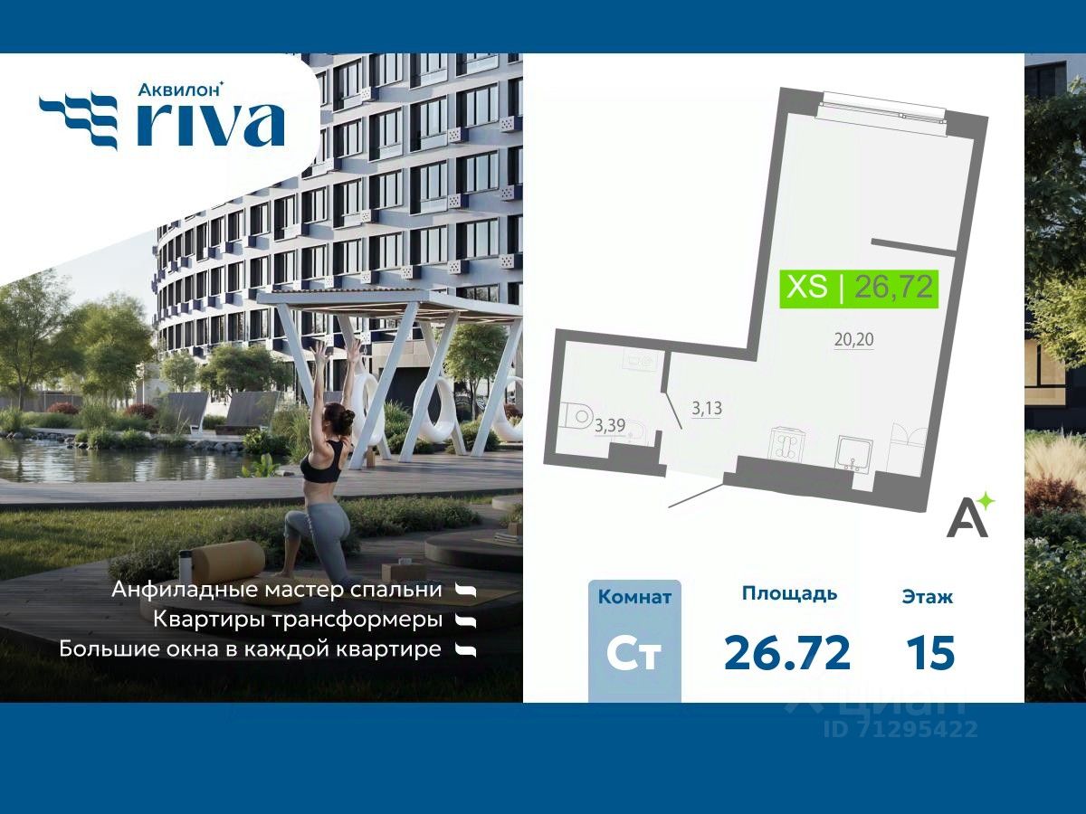 1-комн. квартира-студия от застройщика с отделкой в ЖК "Аквилон RIVA" на 15 этаже. Общая площадь: 26.72 кв.м., площадь гостиной 20.2 кв.м., из которых 5 кв.м. выделено под кухонную зону. Все окна выходят на одну сторону. В квартире один совмещенный санузел. Высота потолков 2.73 м.