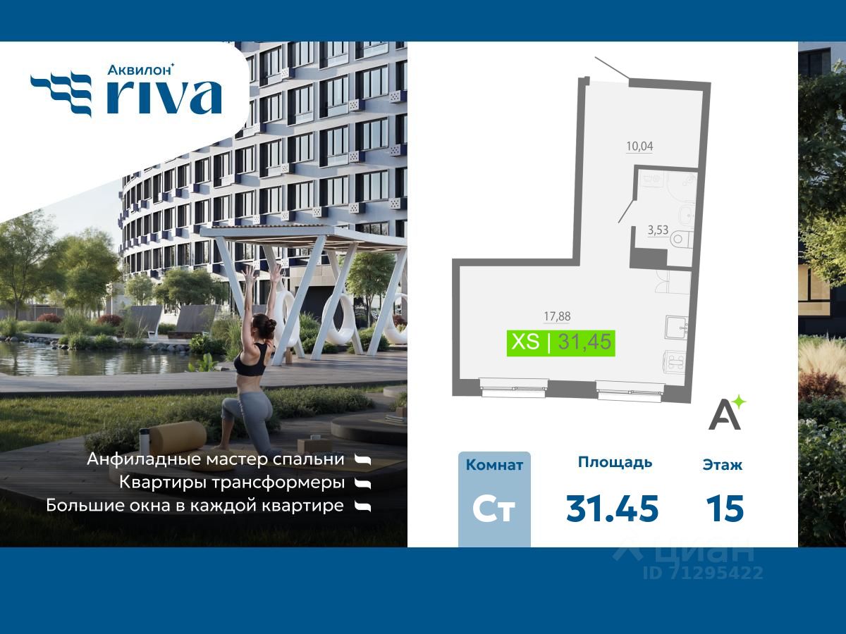Продается однокомнатная квартира-студия с отделкой в ЖК "Аквилон RIVA" на 15 этаже. Общая площадь: 31.45 кв.м., площадь гостиной 19.94 кв.м., из которых 5 кв.м. выделено под кухонную зону. Все окна выходят на одну сторону. В квартире один совмещенный санузел. Высота потолков 2.73 м.
