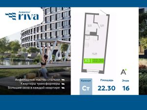 1-комн. квартира-студия с отделкой в ЖК "Аквилон RIVA" на 16 этаже. Общая площадь: 22.3 кв.м., площадь гостиной 13.24 кв.м., из которых 5 кв.м. выделено под кухонную зону. Все окна выходят на одну сторону. В квартире один совмещенный санузел. Высота потолков 2.73 м.