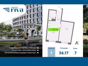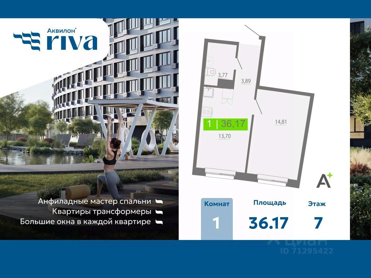 Продается однокомнатная квартира с отделкой в ЖК "Аквилон RIVA" на 7 этаже. Общая площадь: 36.17 кв.м., площадь просторной кухни-столовой: 13.7 кв.м. Высота потолков 2.73 м.