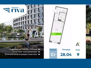 Однокомнатная квартира-студия с отделкой в ЖК "Аквилон RIVA" на 9 этаже. Общая площадь: 28.04 кв.м., площадь гостиной 17.4 кв.м., из которых 5 кв.м. выделено под кухонную зону. Все окна выходят на одну сторону. В квартире один совмещенный санузел. Высота потолков 2.73 м.