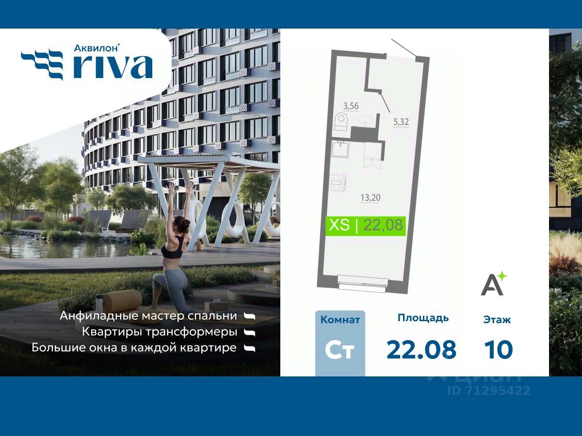 Однокомнатная квартира-студия с отделкой в ЖК "Аквилон RIVA" на 10 этаже. Общая площадь: 22.08 кв.м., площадь гостиной 13.2 кв.м., из которых 5 кв.м. выделено под кухонную зону. Все окна выходят на одну сторону. В квартире один совмещенный санузел. Высота потолков 2.73 м.
