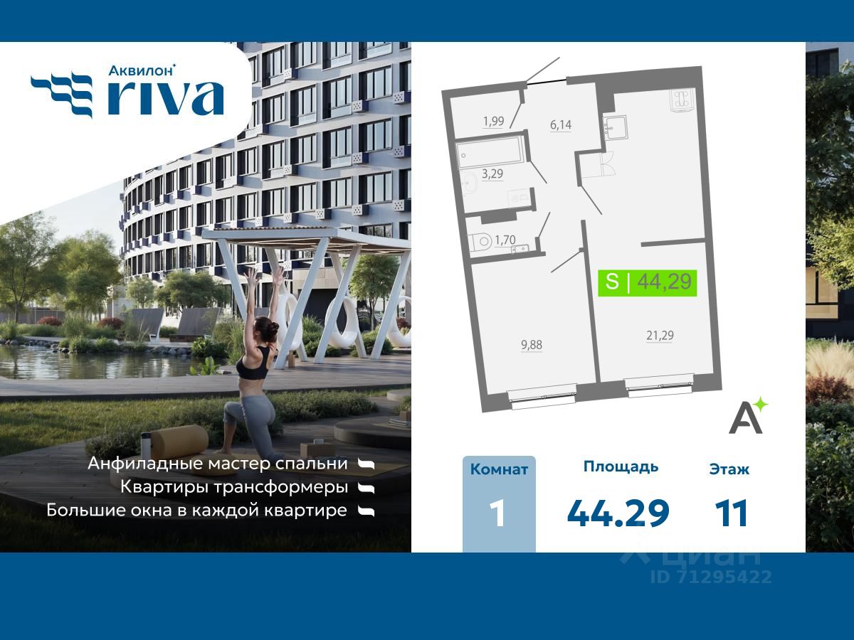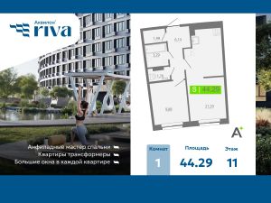 Просторная 1-комн. квартира с отделкой в ЖК "Аквилон RIVA" на 11 этаже. Общая площадь: 44.29 кв.м., площадь просторной кухни-столовой: 21.29 кв.м. Высота потолков 2.73 м.