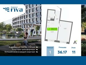 1-комн. квартира с отделкой в ЖК "Аквилон RIVA" на 11 этаже. Общая площадь: 36.17 кв.м., площадь просторной кухни-столовой: 13.7 кв.м. Высота потолков 2.73 м.