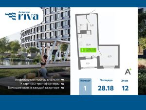 1-комн. квартира с отделкой в ЖК "Аквилон RIVA" на 12 этаже. Общая площадь: 28.18 кв.м., площадь просторной кухни-столовой: 10.94 кв.м. Высота потолков 2.73 м.