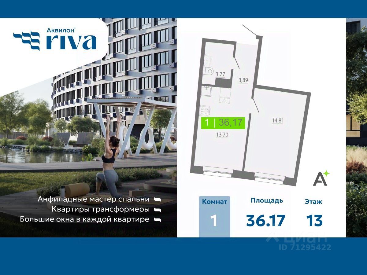 Продается 1-комн. квартира от застройщика с отделкой в ЖК "Аквилон RIVA" на 13 этаже. Общая площадь: 36.17 кв.м., площадь просторной кухни-столовой: 13.7 кв.м. Высота потолков 2.73 м.