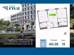 2-комн. квартира с отделкой в ЖК "Аквилон RIVA" на 15 этаже. Общая площадь: 60.28 кв.м., площадь просторной кухни-столовой: 18.28 кв.м. Высота потолков 2.73 м.