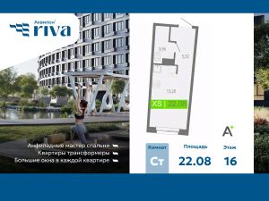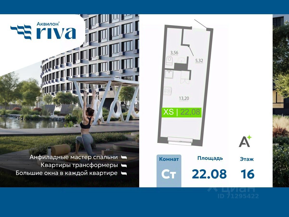 Однокомнатная квартира-студия от застройщика с отделкой в ЖК "Аквилон RIVA" на 16 этаже. Общая площадь: 22.08 кв.м., площадь гостиной 13.2 кв.м., из которых 5 кв.м. выделено под кухонную зону. Все окна выходят на одну сторону. В квартире один совмещенный санузел. Высота потолков 2.73 м.