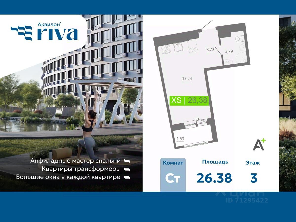 Продается 1-комн. квартира-студия с отделкой в ЖК "Аквилон RIVA" на 3 этаже. Общая площадь: 26.38 кв.м., площадь гостиной 17.24 кв.м., из которых 5 кв.м. выделено под кухонную зону. Все окна выходят на одну сторону. В квартире один балкон, один совмещенный санузел. Высота потолков 2.73 м.