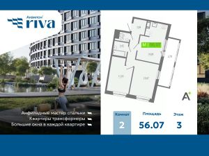2-комн. квартира от застройщика с отделкой в ЖК "Аквилон RIVA" на 3 этаже. Общая площадь: 56.07 кв.м., площадь просторной кухни-столовой: 14.68 кв.м. Высота потолков 2.73 м.