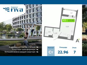 Просторная однокомнатная квартира-студия с отделкой в ЖК "Аквилон RIVA" на 7 этаже. Общая площадь: 22.96 кв.м., площадь гостиной 15.09 кв.м., из которых 5 кв.м. выделено под кухонную зону. Все окна выходят на одну сторону. В квартире один балкон, один совмещенный санузел. Высота потолков 2.73 м.