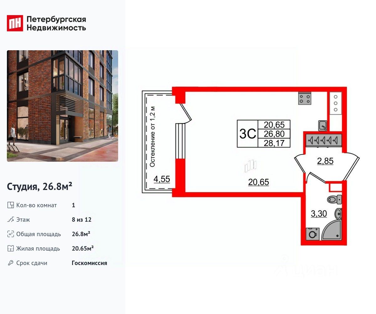 Удобная, классическая, функциональная европланировка, вместительная прихожая 2.85 м². Общая площадь студии - 26.8 м², жилая 20.65 м², высота потолка 2.77 м.
