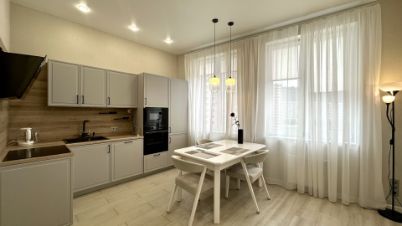 • Квартира евро-планировки с большой кухней-гостиной, а наличие двух больших окон в помещении, создает дополнительное естественное освещение. Площадь кухни-гостиной 15 кв.м, современный кухонный гарнитур со встраиваемой техникой остается в подарок новым владельцам.