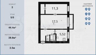 Общая площадь 44,4 кв.м., комнаты 17, 5 и 11, 3 кв.м., кухня 5,52 кв.м.