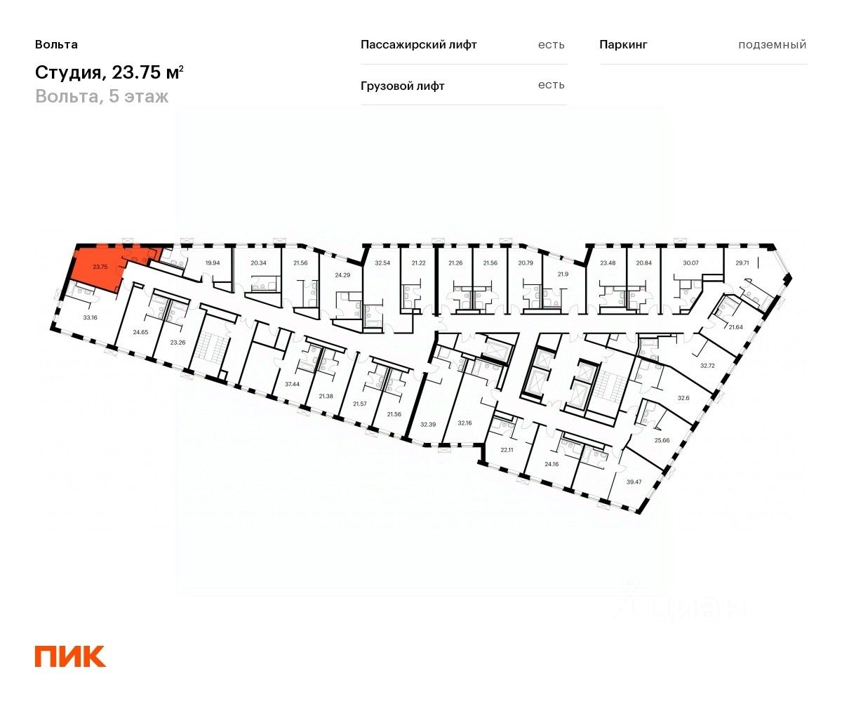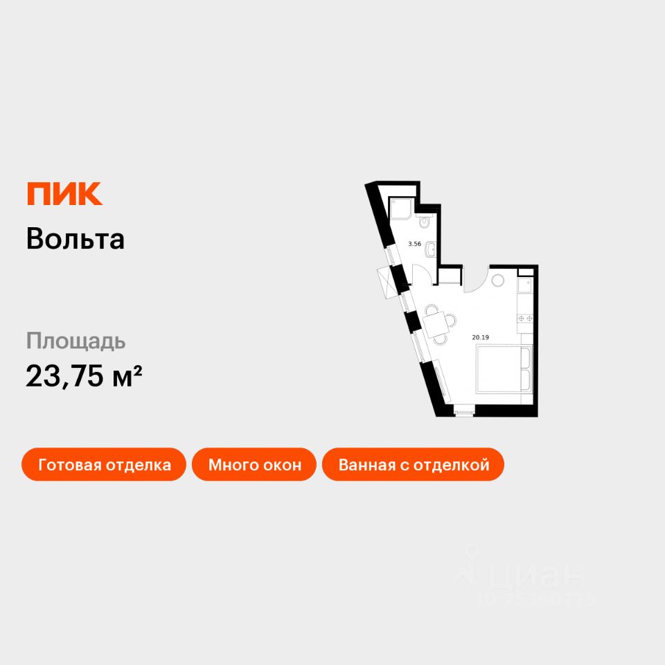 Продаются апартаменты-студия площадью 23,75 кв.м на 5 этаже 15 этажного дома (Вольта, Секция 1) проекта ПИК Вольта.