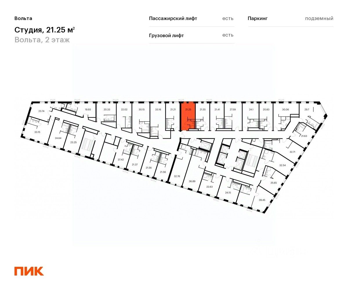 Продаются апартаменты-студия площадью 21,25 кв.м на 2 этаже 15 этажного дома (Вольта, Секция 1) проекта ПИК Вольта.