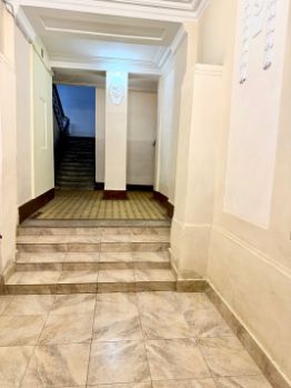Великолепная чистая, отремонтированная парадная с высокими потолками, лепниной на стенах и витражами на окнах.