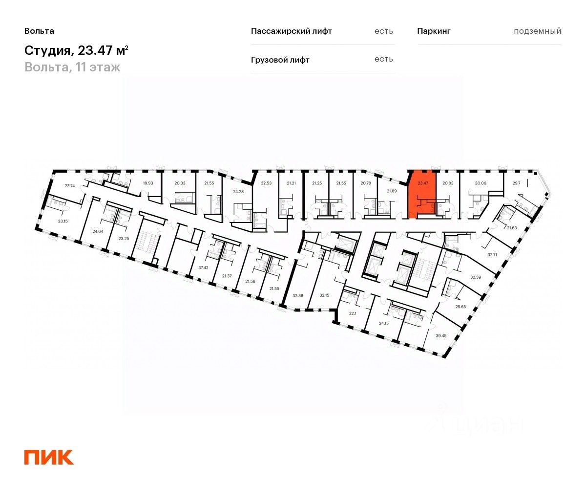 Продаются апартаменты-студия площадью 23,47 кв.м на 11 этаже 15 этажного дома (Вольта, Секция 1) проекта ПИК Вольта.
