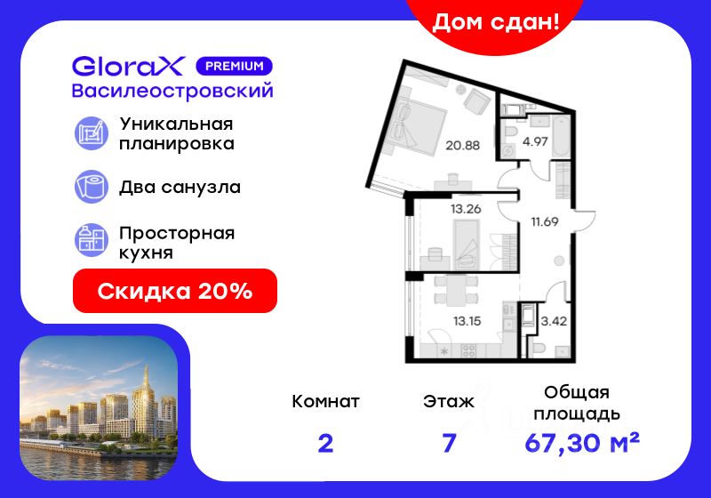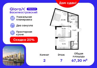 Продается 2-комн. квартира на 7-м этаже в сданном проекте премиум-класса GloraX Premium Василеостровский. Общая площадь лота составляет 67,37 кв. м, из которых 34,14 кв. м отведено под жилую и 13,15 кв. м под кухонную зону. Номер квартиры - 150