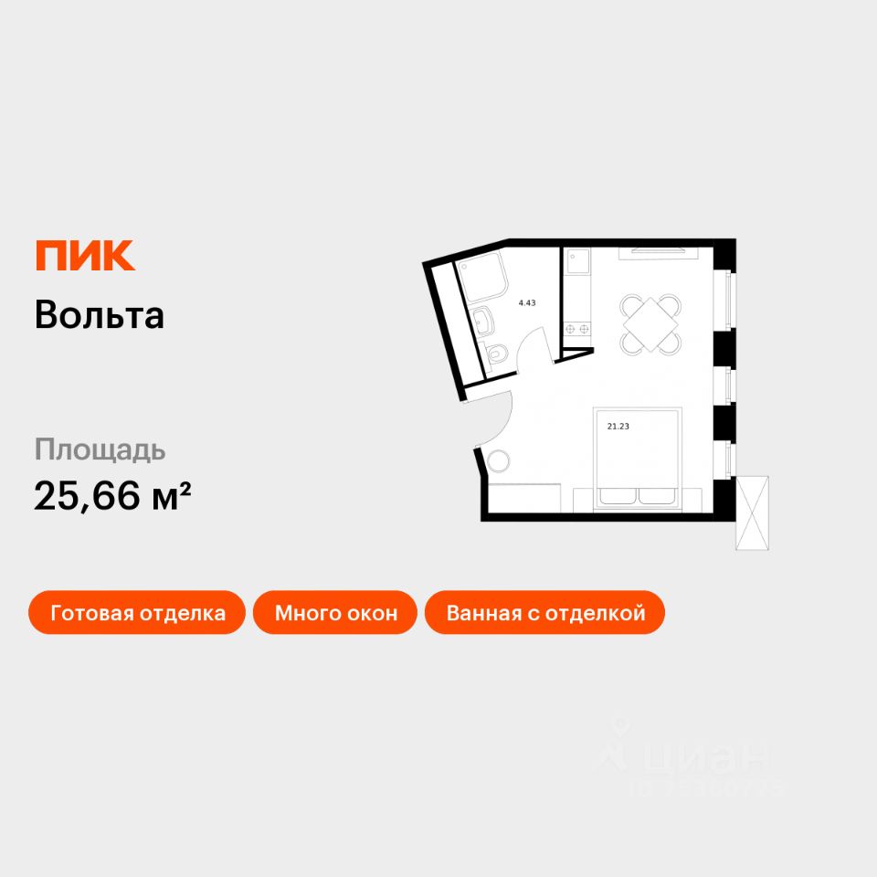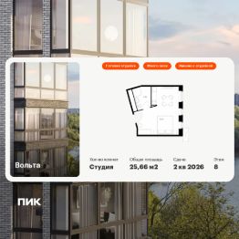 Продаются апартаменты-студия площадью 25,66 кв.м на 8 этаже 15 этажного дома (Вольта, Секция 1) проекта ПИК Вольта.