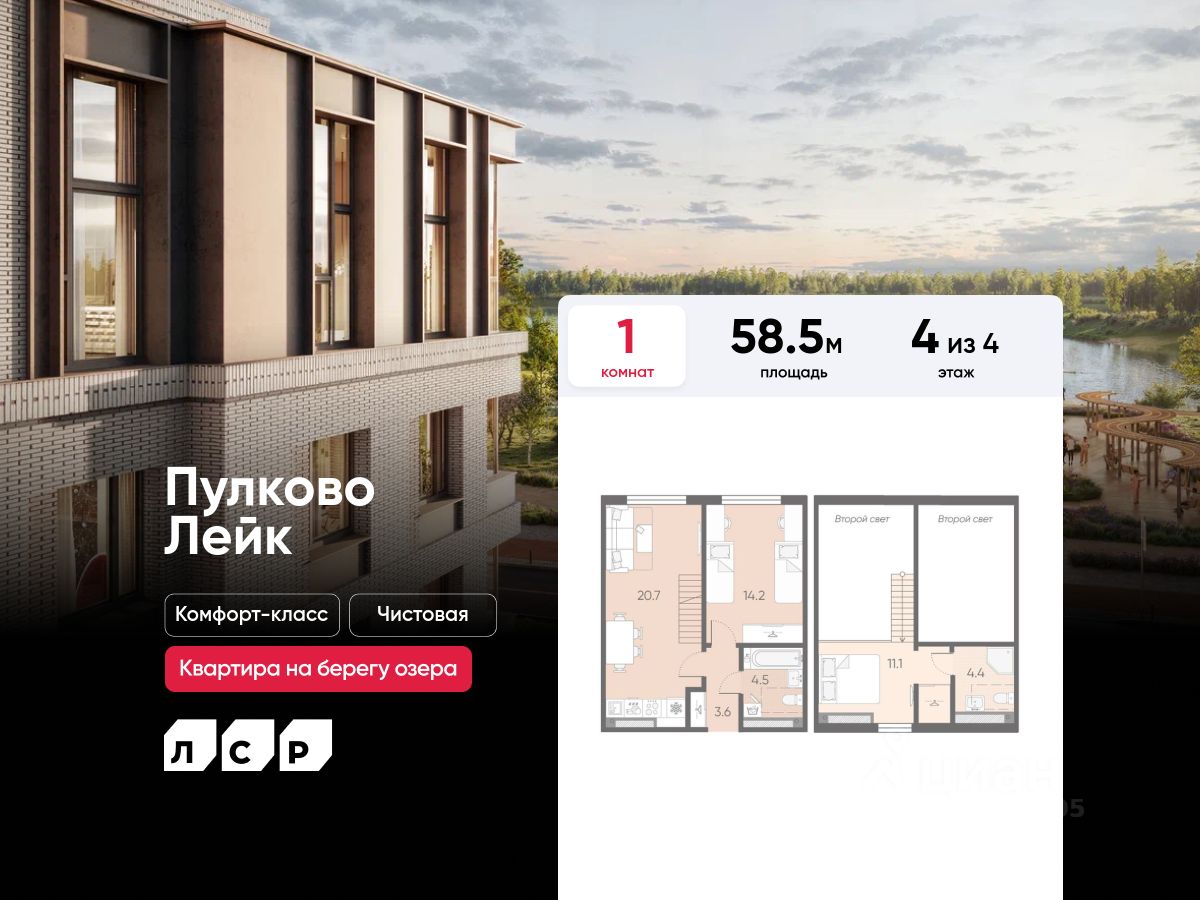 Продается 1-комнатная квартира в ЖК "Пулково Лейк" на 4 этаже. Общая площадь составляет 58.50 кв. м. Квартира с чистовой отделкой. Жилой комплекс "Пулково Лейк" располагается по адресу Санкт-Петербург, Московский.