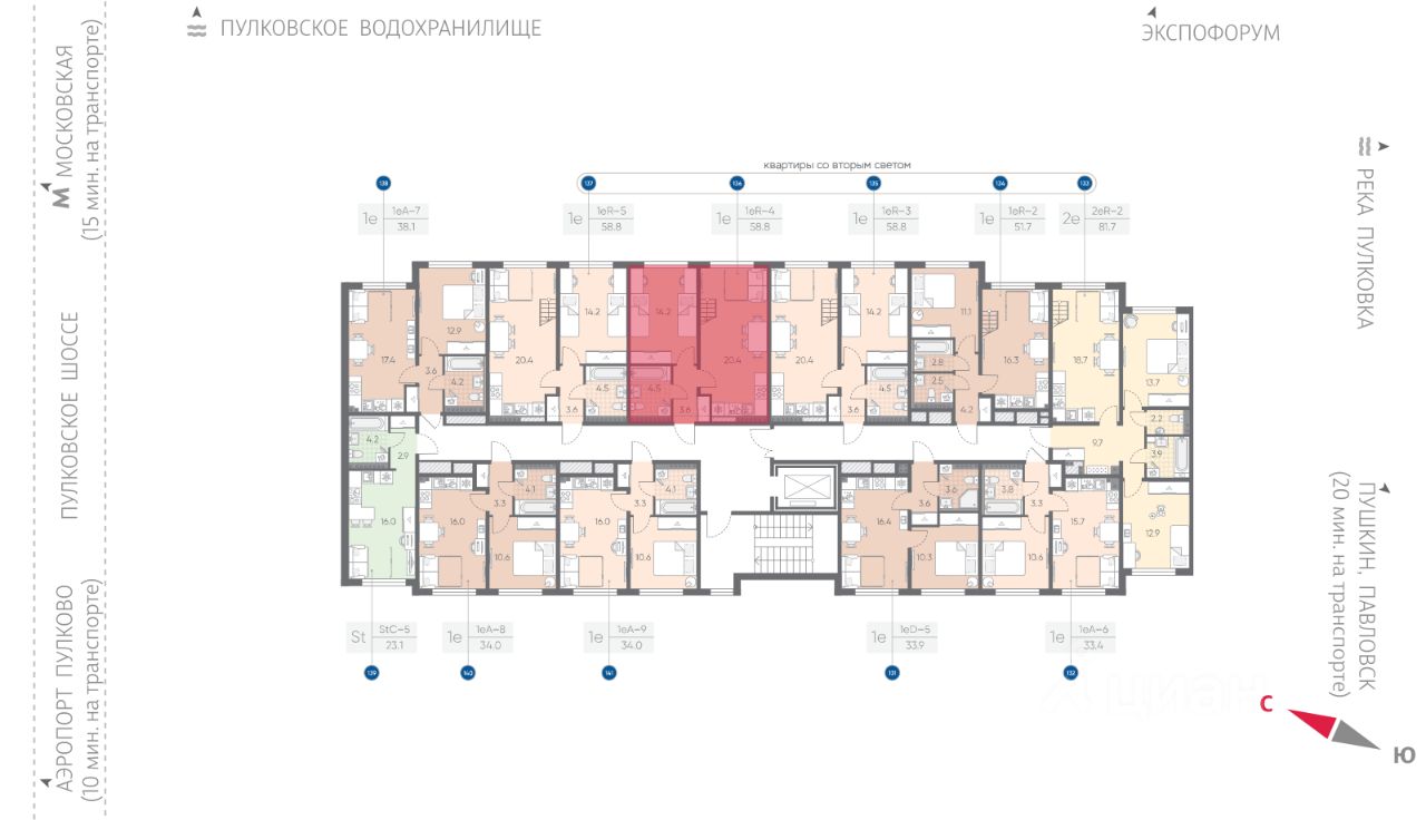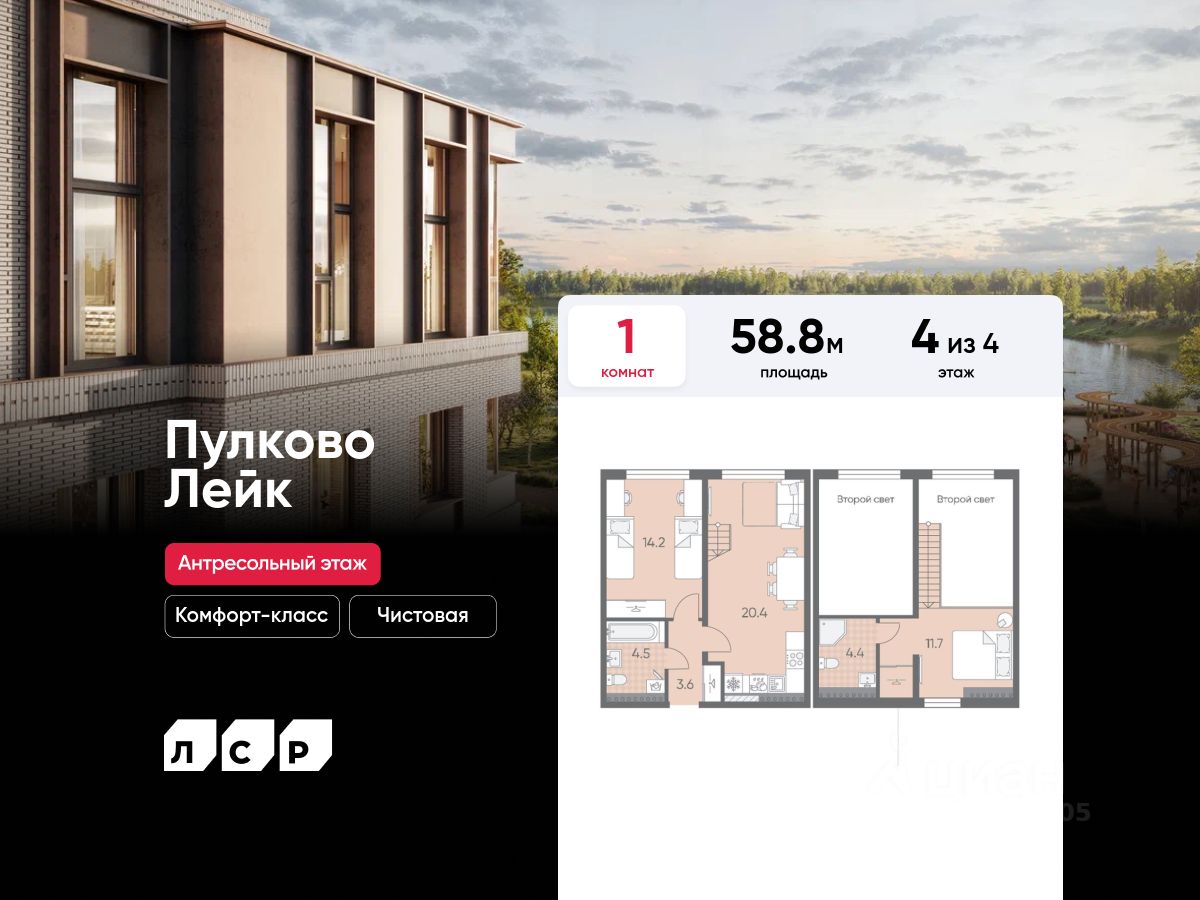 Продается 1-комнатная квартира в ЖК "Пулково Лейк" на 4 этаже. Общая площадь составляет 58.80 кв. м. Квартира с чистовой отделкой. Особенность планировки - антресольный этаж, дополнительное пространство для отдыха, работы или хранения. Жилой комплекс "Пулково Лейк" располагается по адресу Санкт-Петербург, Московский.