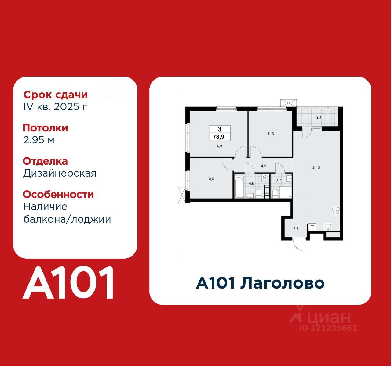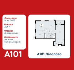 3-комнатная квартира площадью 78.90 в ЖК "А101 Лаголово" c лоджией на 6 этаже. Квартира с отделкой. Вид из окна во двор. В квартире 2 санузла. Высота потолков 2.95 м. Ключи в 2025 году.