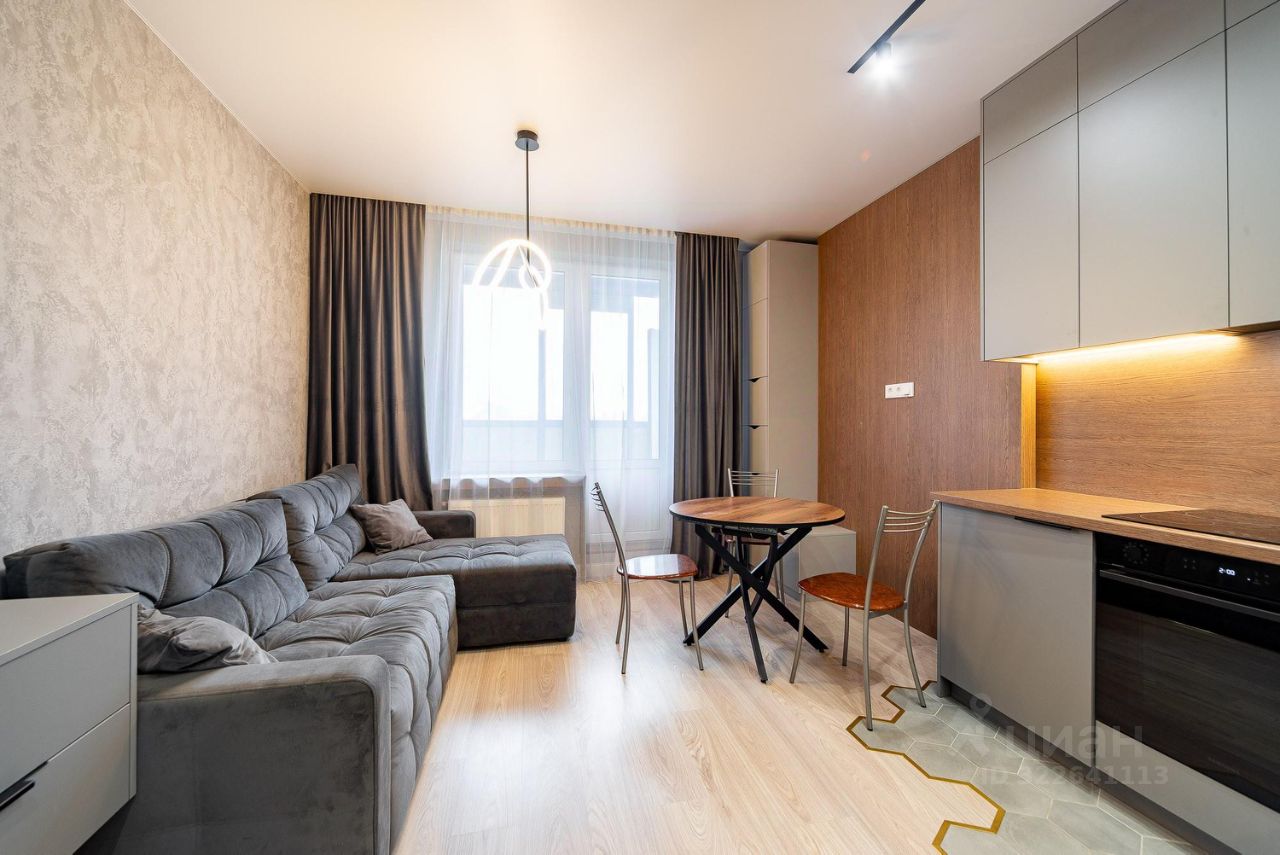 Формат — просторная кухня-гостиная 15,8 м² с обеденной зоной и уютным диваном, отдельная спальня 13 м², прихожая и ванная комната с полноценной ванной.
